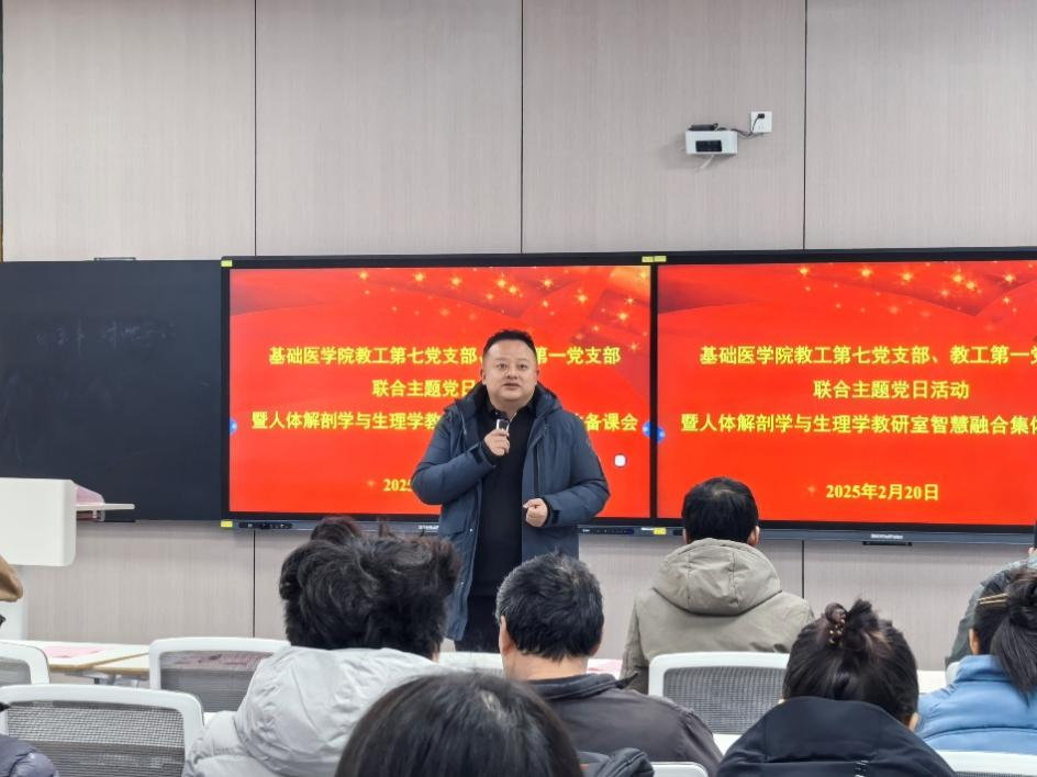 2 月 20 日,best365官网教工第七党支部、第一党支部在公司 L104S 智慧教室联合举办主题党日活动暨人体解剖学与生理学教研室智慧融合集体备课会议。此次活动旨在通过集体研讨,促进教师深入钻研教材,将解剖知识与生理学原理融合,提升教学效果和专业素养。集团教学质量监控与评估办公室主任兼教务处副处长修江帆、公司副经理余资江及教研室全体教师参会。活动由人体解剖学教研室主任孙宝飞主持。