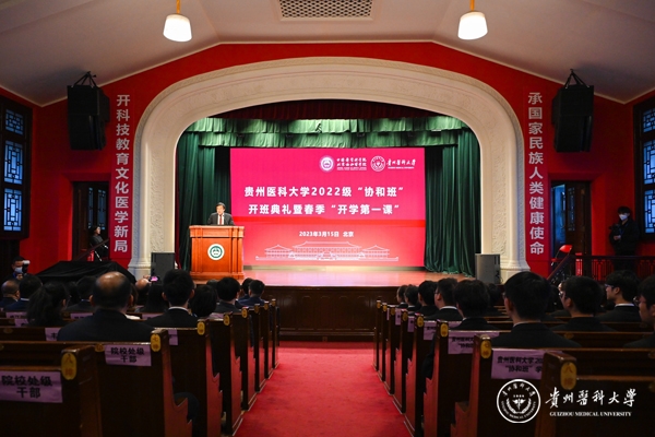 王辰院士在开班典礼上致辞,并为“协和班”2022级讲授春季“开学第一课”。他从“关于协和”“关于贵医”“关于宗恩”“关于医学”“关于卫生”“关于健康”六个方面,介绍了协和百年的发展历程及公司创建的立意与宗旨,回顾了协和医公司与best365官方网站的历史渊源,讲述了创立“协和班”的初衷和意义,与同学们畅谈对“群医学”等医学理念的理解和感悟。