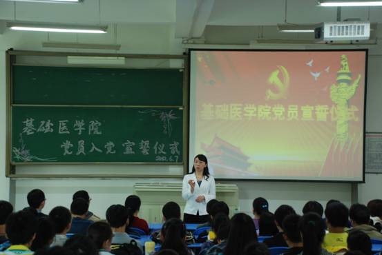 6月7日公司在基础二号楼2201教室举行了新党员宣誓仪式。出席此次仪式的有基础医公司党委书记张红霞老师、各年级员工党支部书记及120名预备党员。宣誓仪式由2010级员工党支部书记罗恒老师主持。