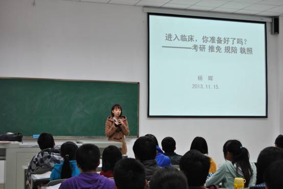 为进一步促进2013级卓越医师班员工对临床专业的深入了解,尽早明确今后努力的方向与目标,增强卓越医师班员工学医的坚定信念,医员工物工程系团委副书记杨晖老师应卓越班深情相邀,于2013年11月15日下午4:30在4308教室,给卓越班全体同学进行了以“进入临床,你准备好了吗?——考研推免 规陪 执照”的主题讲座,讲座由卓越班班主任董然然主持。
