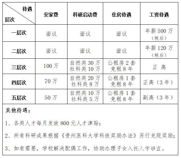 加盟贵医,公司将为你提供安家费、科研启动经费、人才津贴、住房保障、安置配偶、协助子女入学入托等待遇。同时,公司具有完善的人才培养及科研奖励制度,确保人才进校后既有发展空间又能实现人生价值。具体待遇详见下表: