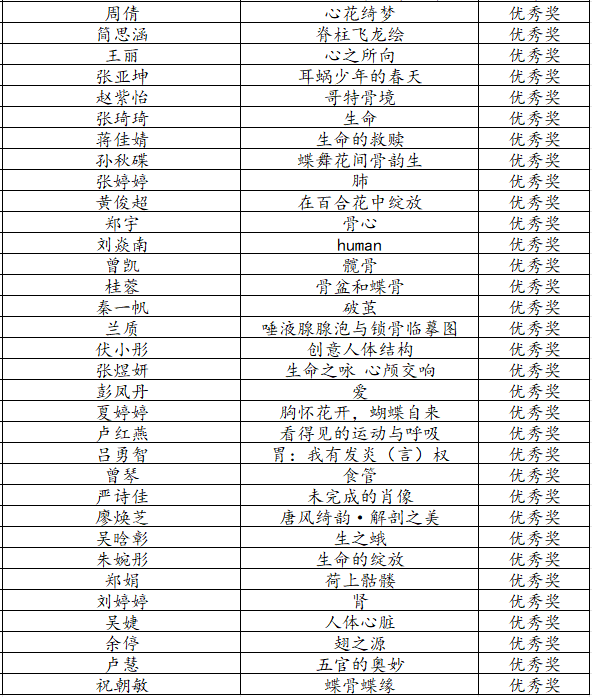 best365官网第六届人体解剖学与组织胚胎学手绘大赛已经落下帷幕,本次大赛充分调动基础学子参与医学绘图的积极性,以生动的画笔描绘医学知识的深刻,激发员工探索医学和艺术之间的学科融合。在前期提交的166份作品中,经过教研室专业教师从科学性、艺术性和创新性三个维度综合评分后,共60份作品进入决赛,经过激烈的角逐,最终评选出特等奖2名、一等奖4名、二等奖8名、三等奖12名、优秀奖若干。