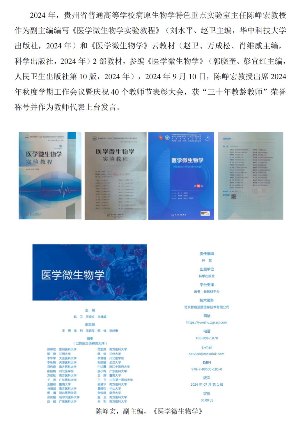 贵州省普通高等公司病原生物学特色重点实验室2024年度教师编写教材和获荣誉情况