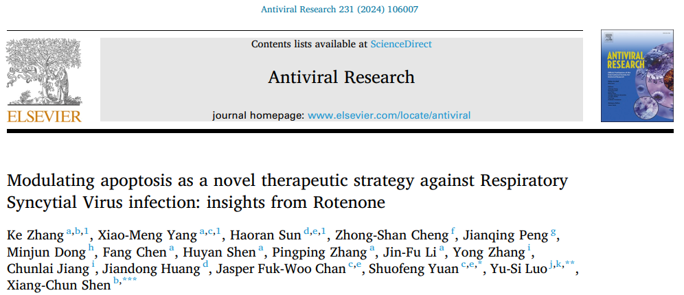 2024年9月,我室张科副教授课题组在JCR1区、中科院2区期刊Antiviral Research(影响因子:4.5)在线发表论著《Modulating apoptosis as a novel therapeutic strategy against Respiratory Syncytial Virus infection: insights from Rotenone》(通过调控细胞凋亡抑制呼吸道合胞病毒感染:由鱼藤酮获得的启发),该论著由我室与香港大学李嘉诚医公司微生物学系袁硕峰教授课题组合作完成,目前在袁硕峰教授课题组工作的杨筱萌认共同一作。