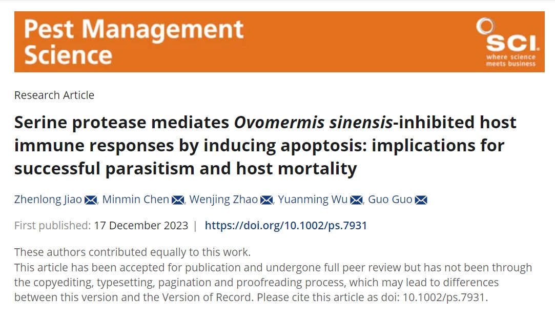 202312月,我实验室焦振龙副教授为第一作者,国果教授为通讯作者在中科院1Top期刊《Pest Management Science》发表题为Serine protease mediates Ovomermis sinensis-inhibited host immune responses by inducing apoptosis: implications for successful parasitism and host mortality的研究论文。该研究得到了国家自然科学基金项目、贵州省科技计划项目和贵州省自然科学基金项目的支持。