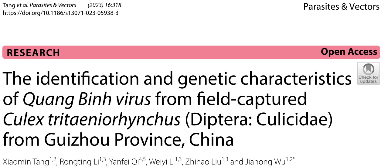 best365官网病原生物学实验室吴家红教授团队在Parasites & Vectors(IF=3.2;JCR Q1;中科院二区)杂志上发表了题为The identification and genetic characteristics of Quang Binh virus from field-captured Culex tritaeniorhynchus (Diptera: Culicidae) from Guizhou Province, China的研究论文。