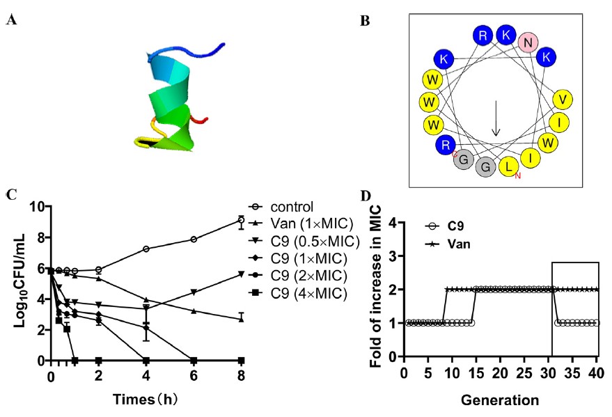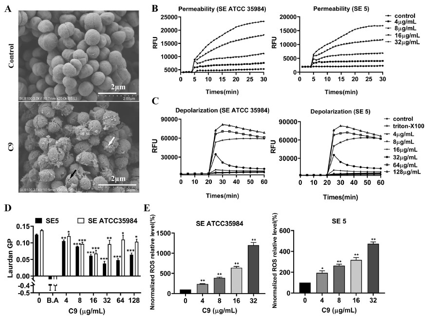 1. C9表现出对表皮葡萄球菌的杀菌活性,且不易导致耐药。