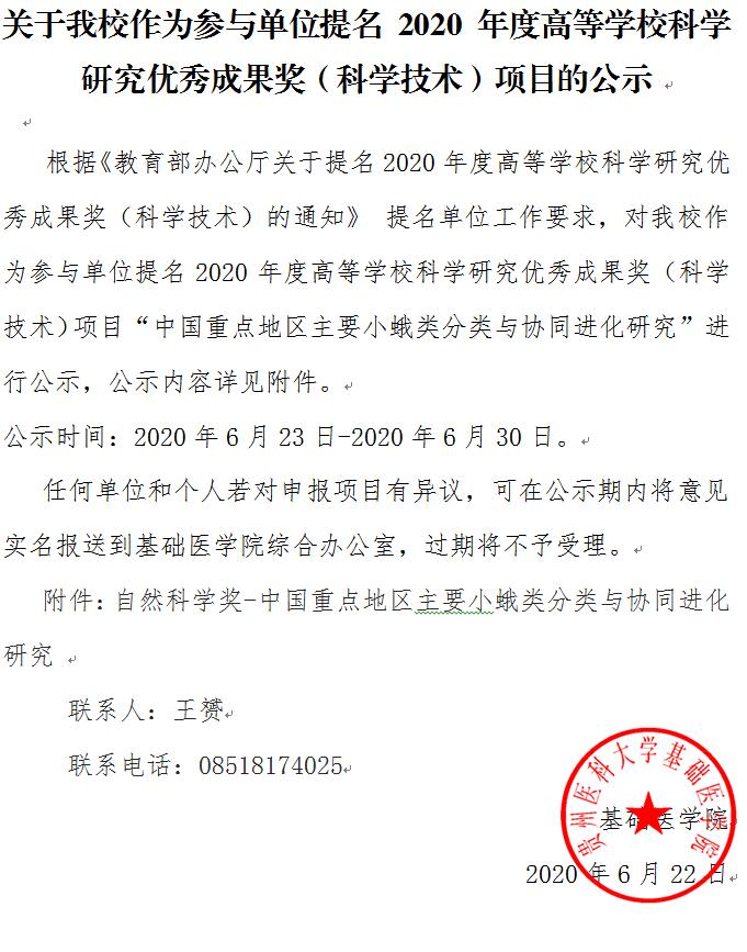 关于公司作为参与单位提名2020年度高等公司科学研究优秀成果奖(科学技术)项目的公示