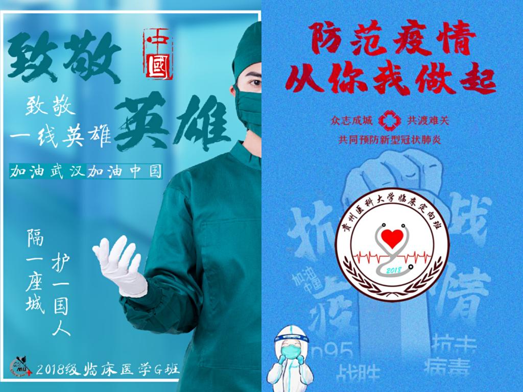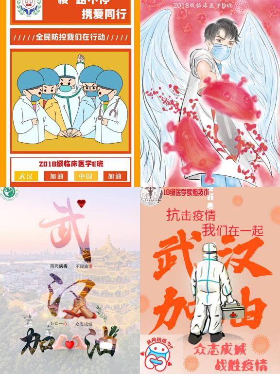 在这场没有硝烟的战争里,临床医学A、E、定向、基础医学班分别以海报展示我们拥有强大的祖国,团结的人民和坚定的信念,抗击疫情全民防控,团结一心,胜利终将属于我们。没有生而英勇,只有选择无畏。终有一日,雄狮轻起舞,英雄奋九州。
