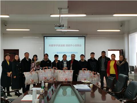 最后,全体参会领导和老师为毕业生送温暖,发放慰问品并合影留念。