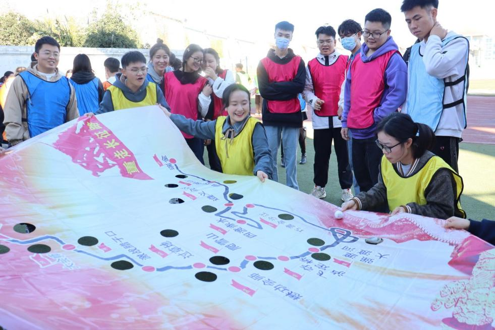 天朗气清,惠风和畅。全体师生随机分为6组,每组以最快的速度“集结队伍”,确定队名、口号等。在“重走长征路”项目,主持人在红军长征路线图前为大家生动讲解了红军长征故事,回顾长征历史。为了加深大家对红军长征路线图的记忆,每个队伍借助网球,从江西瑞金出发,依次经过长征途中的重要地点,最后抵达陕西延安,感受红军战士们长征中不畏艰难险阻、团结合作的伟大精神。
