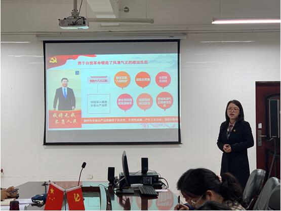 王妤煜从中国共产党有“强大的组织优势、坚实的群众基础、彻底的自我革命”三个方面进一步阐述“中国共产党为什么能”。她强调,一个松松垮垮、稀稀拉拉的组织,是不能干事,也干不成事,加强纪律建设是全面从严治党的根本之策,在“党纪面前人人平等”,违纪必究,违纪必严。她讲到中国共产党始终坚持以人民利益为中心,并且勇于自我革命,是我们党最鲜明的品格,是中国共产党的光荣传统。在新冠疫情防控过程中,共产党人用实际行动让人民有获得感、幸福感、安全感,得到老百姓的衷心拥护和坚定支持。她希望广大师生党员要认真学好四本书——习近平《论中国共产党历史》、《毛泽东、邓小平、江泽民、胡锦涛关于中国共产党历史论述摘编》、《习近平新时代中国特色社会主义思想学习问答》、《中国共产党简史》,在党史学习中汲取奋进力量。