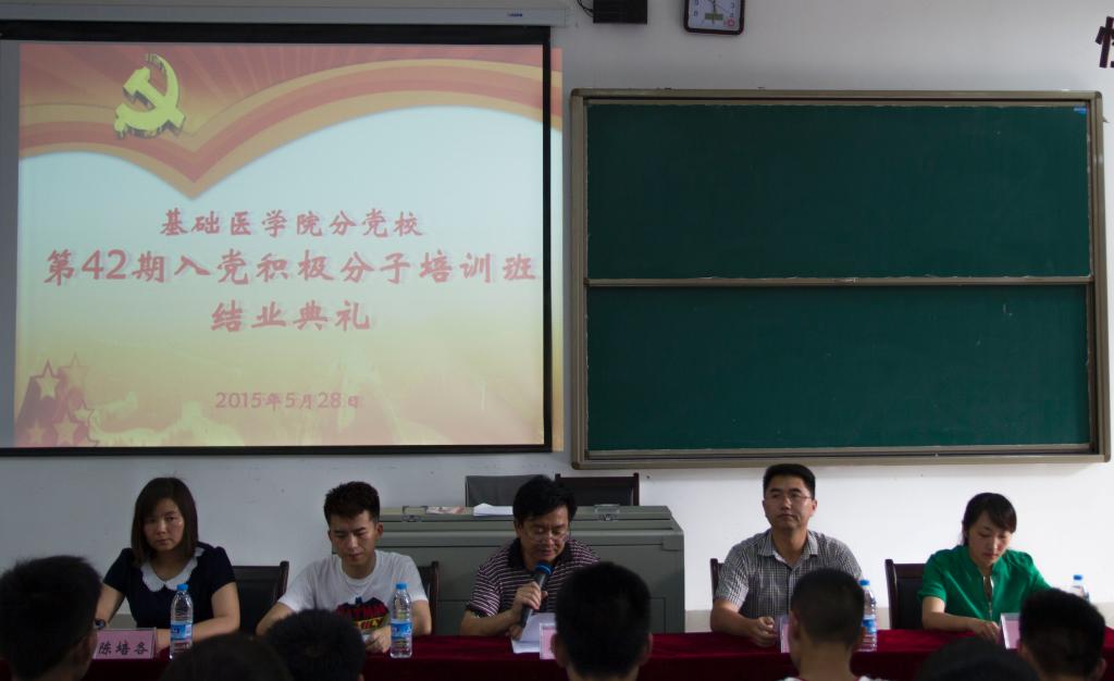 2015年5月28日,best365官网分党校第42期入党积极分子培训班结业典礼在花溪校区1101教室召开,基础医公司党委书记徐国强、基础医公司党委副书记廖兴江、2013级党支部书记罗恒老师、2014级辅导员刘逸洲老师以及本期培训班的班主任陈培各老师出席了毕业典礼。典礼由陈培各老师主持。