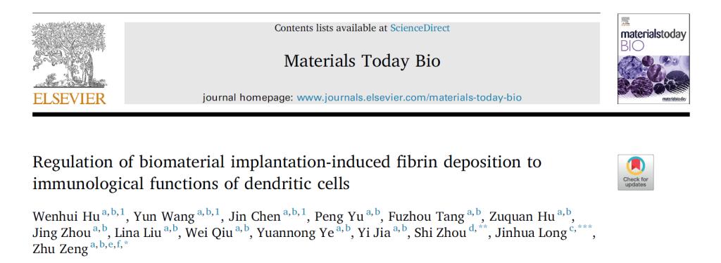 2022年2月26日,best365官网曾柱教授领衔的PI团队在Materials Today Bio杂志上发表了题为Regulation of biomaterial implantation-induced fibrin deposition to immunological functions of dendritic cells的研究论文。该研究发现,DCs能够响应局部病理微环境和力学微环境,表现出明显的形态改变和细胞骨架重构,并获得相应的免疫表型和力学表型,其力学-化学耦合机制涉及RhoA和CDC42信号通路。这项工作不仅有助于更好地理解植入生物材料引发的免疫反应的精确过程,而且对生物材料的合理设计具有重要意义。