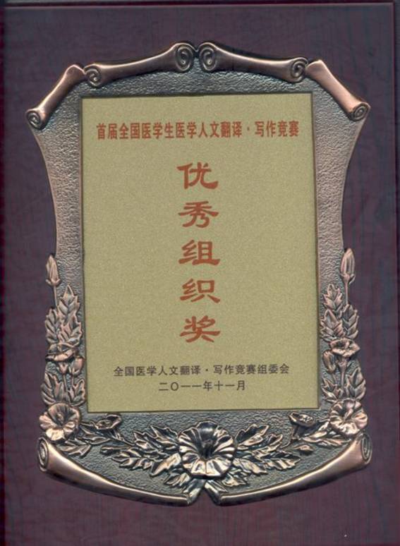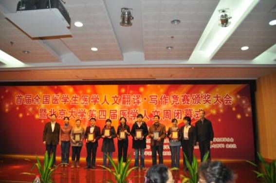 2011年11月10日,首届全国医员工人文翻译•写作竞赛颁奖仪式在北京举行。本次竞赛由教育部高校医药公共基础课程教学指导委员会、中国自然辩证法研究会医学哲学分会、中华医学会医学伦理学分会、健康报社、《英国医学杂志(BMJ)中文版》杂志社、《医学与哲学》杂志社、北京大学医学人文研究院等机构组织联合主办。来自国内25所医公司校近两千名员工提交了参赛作品。公司员工在best365官网副经理曾柱博士的指导下积极参赛,经大赛评委会评审,陈瑞雪、李桐、杨静文、吕文杰4名同学荣获翻译竞赛优秀奖,best365官网荣获优秀组织奖。
