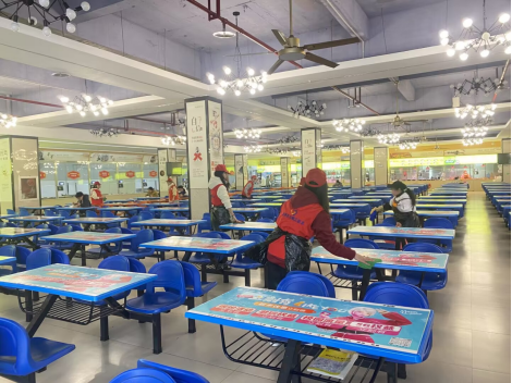 域展开校园清洁活动。同学们积极投身于志愿清洁美化实践活动中,欢声笑语传遍校园认真细致的打扫负责区域的每一个角落。青年志愿者联合会best365官网分会走进一食堂开展义工志愿服务,志愿者分为两组,一组帮助阿姨打扫食餐厅,另一组则负责打扫餐桌,将餐桌上的饭粒、残渣、纸巾等垃圾回收到收餐台处,统一进行处理,打造文明食堂。
